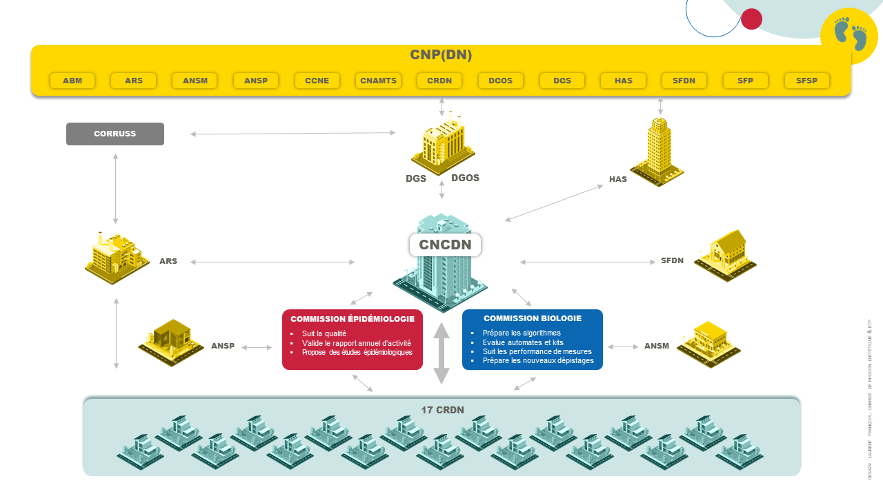 Il existe 17 centres régionaux de dépistage néonatal coordonnés par le Centre National de Coordination du Dépistage Néonatal (CNCDN). Site du CNCDN